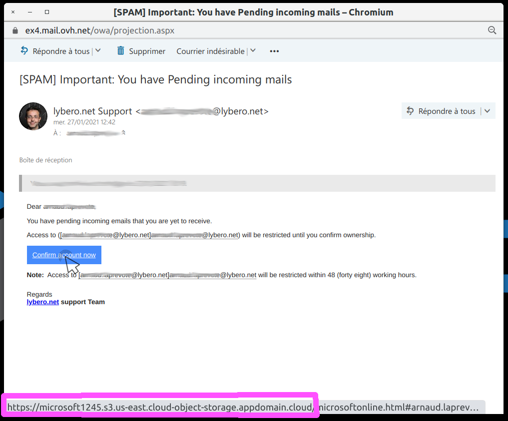 Avec un lien sur « Confirm account now ». Ce message est professionnel, bien fait et trompeur. Lybero.net pourrait envoyer un message de ce type là.